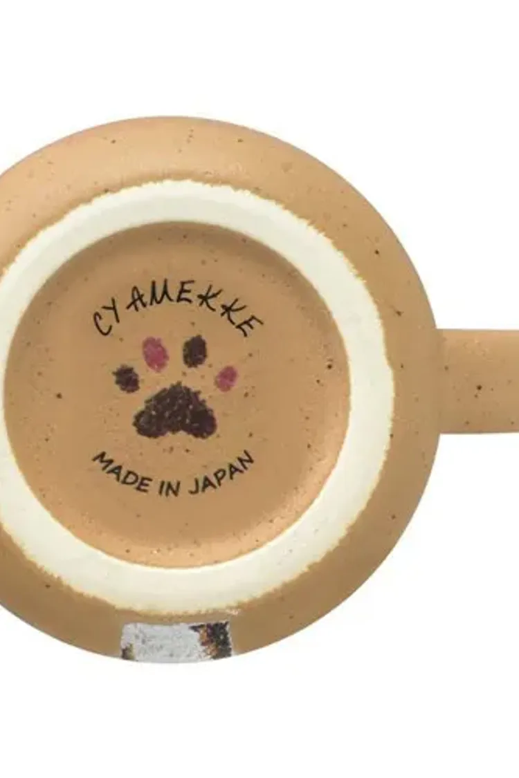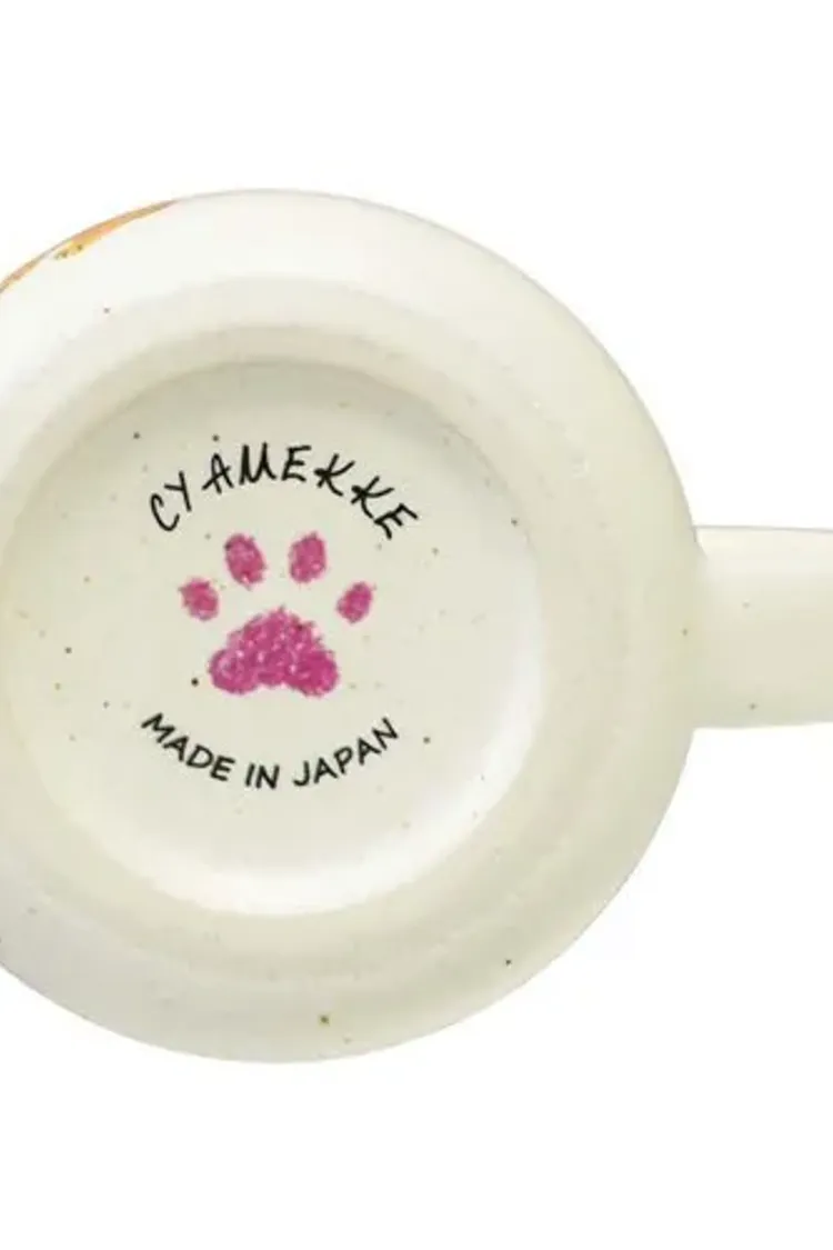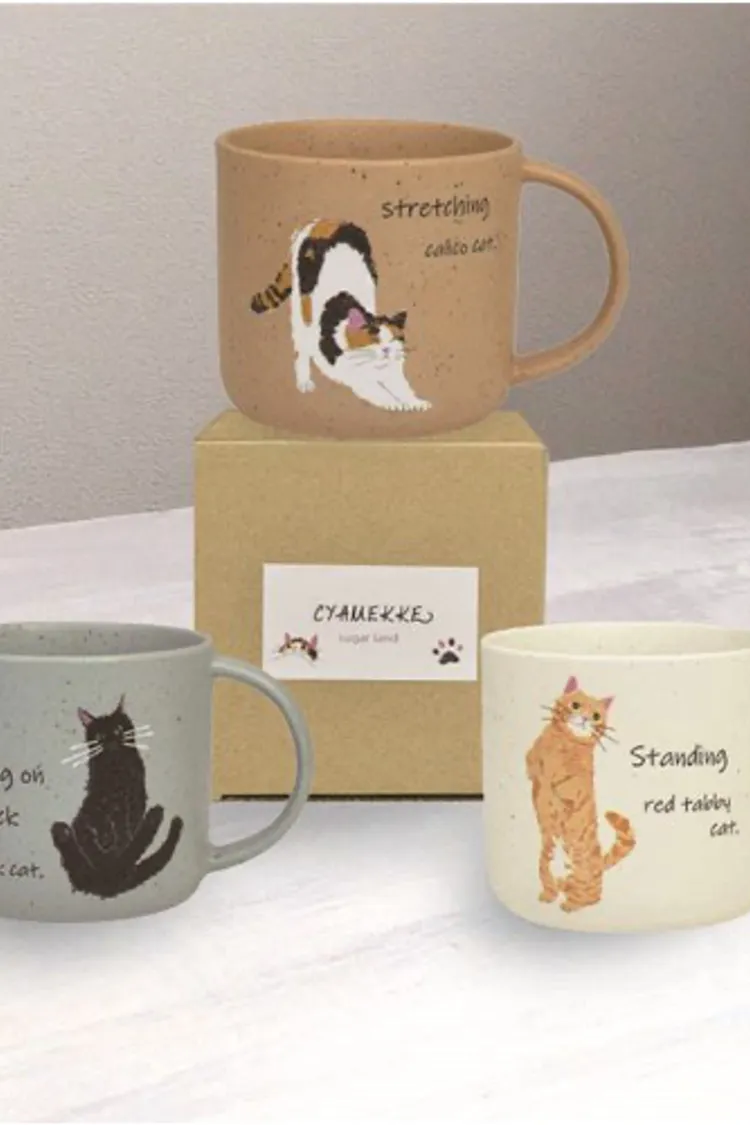 把貓咪可愛又調皮的日常動作畫在杯子上,像是「伸懶腰」、「肚子朝天(へそ天)」、「站立討抱」等充滿 CYAMEKKE(俏皮感) 的姿態,讓人一看就被療癒。