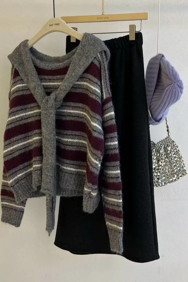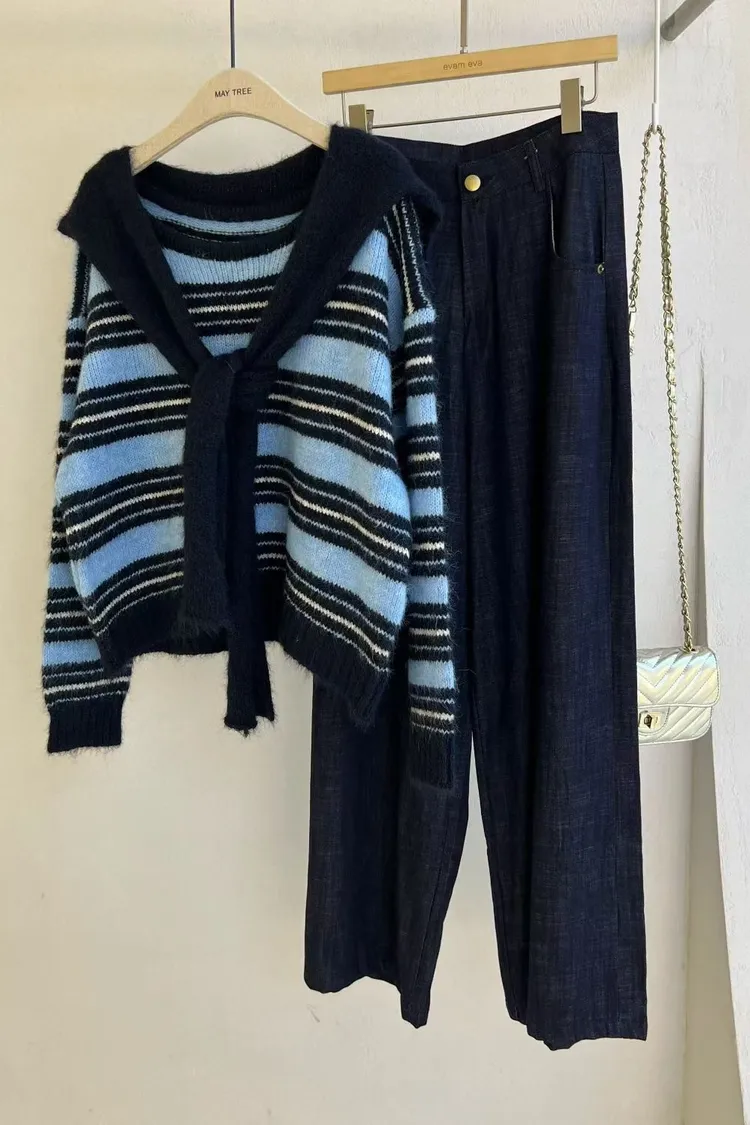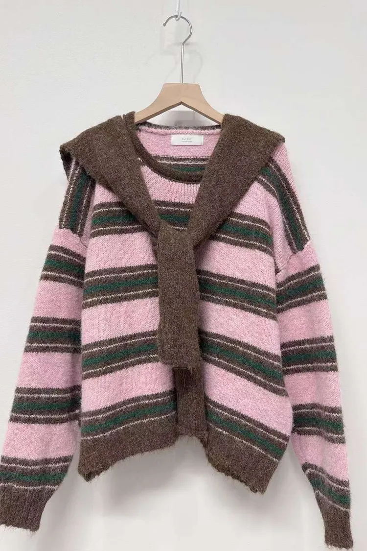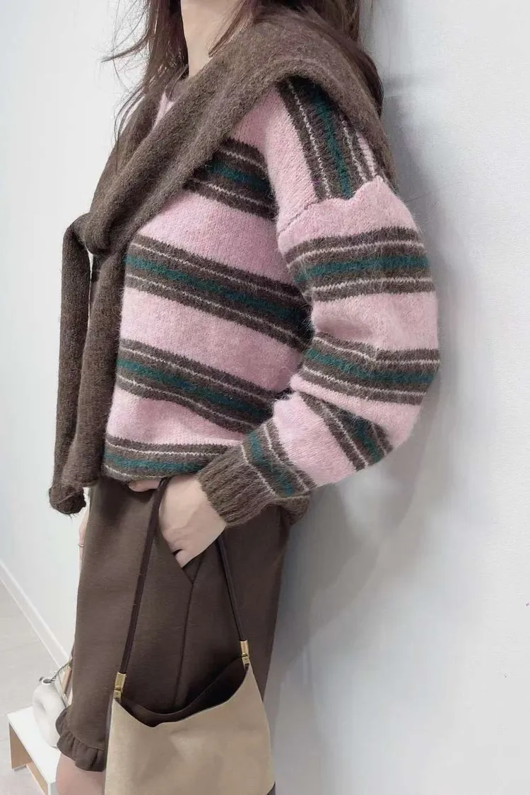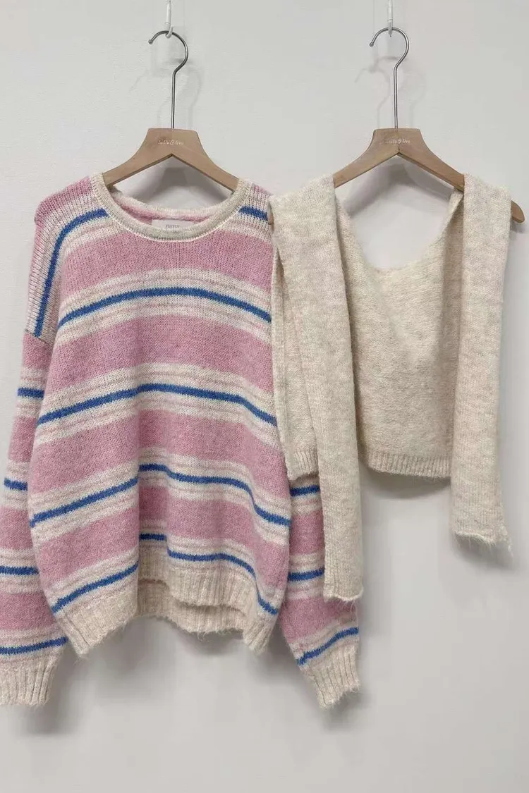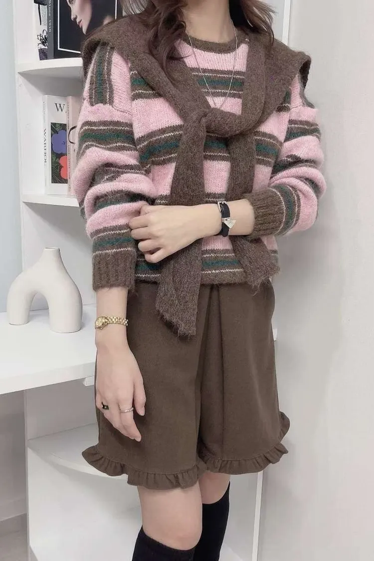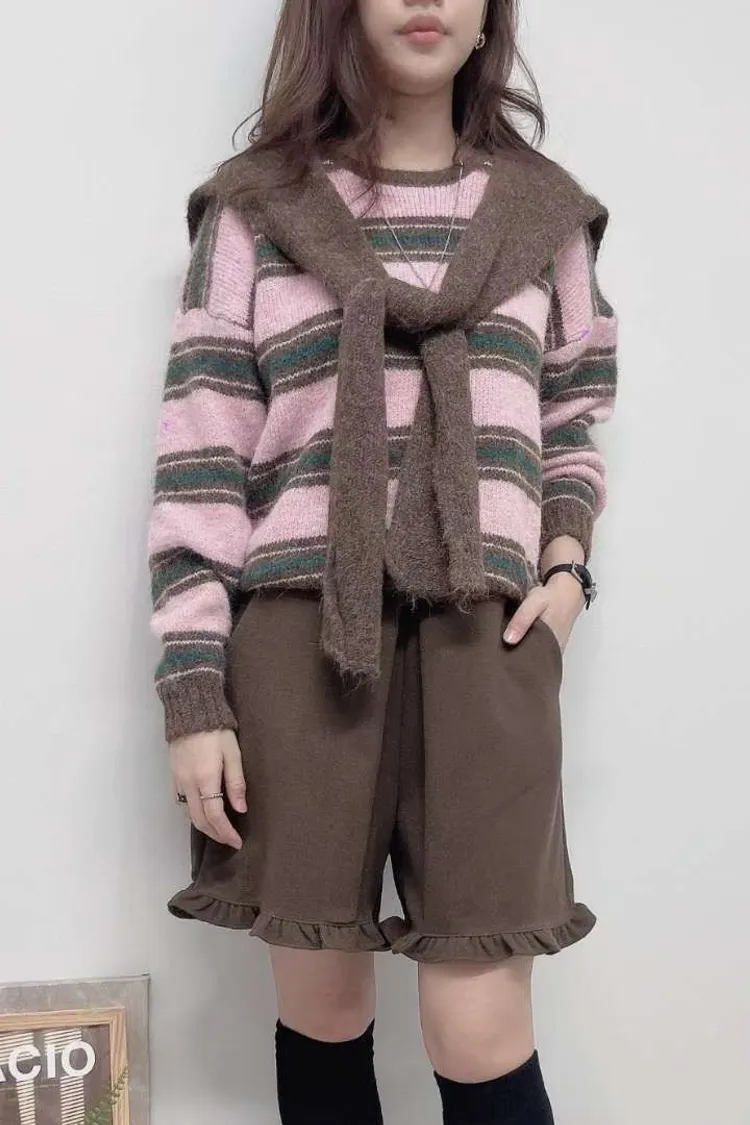 如果不想搭短褲,這件 粉色條紋毛衣+肩披針織背心 其實非常百搭,可以走不同風格。以下整理幾種最好看的搭法: